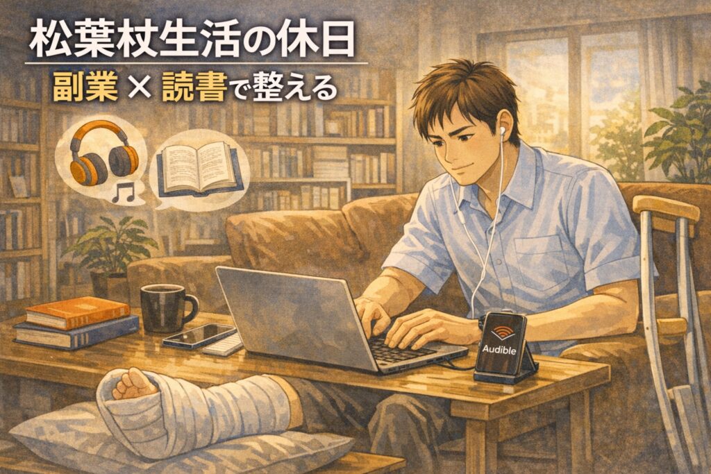 松葉杖生活では移動が大きな負担となるため、自宅で完結できる行動が現実的になります。例えば、読書、オーディブル、ブログ執筆、情報整理などは身体への負担が少なく、かつ将来的にも価値が残る行動です。私自身、本日は読書やオーディブルを活用しながら知識のインプットを行いましたが、これは精神的な充実感を保つ上でも非常に有効でした。