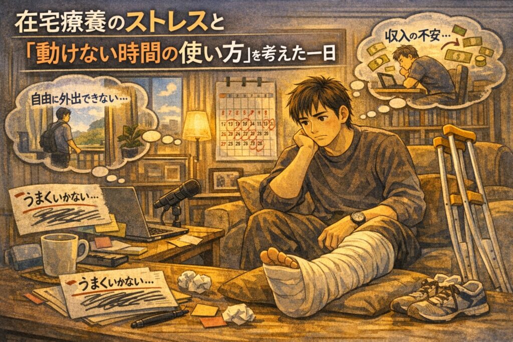 本日は一日を自室で過ごす療養生活の中で、ストレスの蓄積と向き合う現実を強く感じた一日でした。怪我から約1か月が経過した現在も生活の基本は変わらず、ギブス生活と行動制限の中で、外出や運動ができない環境が続いています。この「生活が変わらない時間」は身体以上に精神的な負担となり、在宅療養特有の閉塞感を実感する要因になっています。(内部リンク:在宅療養と生活制限のリアル記録)