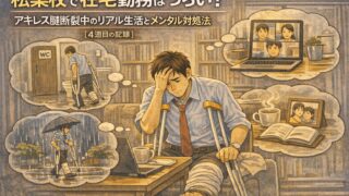 アキレス腱断裂4週目の在宅勤務生活のリアルを記録。松葉杖生活による日常の不便さや、トイレを我慢してしまう生活、部屋でのPC業務によるモチベーション低下、朝のZOOMで感じた安心感など、現在進行形の体験を詳しく解説します。雨の日の電車通勤への不安や転倒リスク、在宅療養中のメンタル管理の考え方も含め、同じ境遇の方に役立つ共感と実用情報をまとめた実体験ブログです。