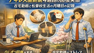 アキレス腱断裂(手術あり)回復期における初めての電車通勤前日のリアルな記録です。松葉杖生活の不安や恐怖、通勤に向けた歩行練習、体の疲労、筋肉低下への焦り、在宅勤務と家族への気遣いなど、実体験ベースで詳しく解説。社会復帰前に感じる心理や転倒リスクへの不安は正常なのか、同じ怪我の方や通勤復帰を控える会社員の参考になる内容をまとめています。回復期の現実と無理をしない行動の重要性を記録した体験記事です。